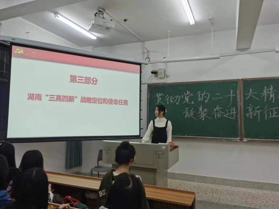 研应用统计与学科教学党支部书记吴丽华从解读二十大报告中教育、科技、人才“三位一体”出发,沿历史脉络讲述我国科教兴国战略的发展与完善,再到湖南“三高四新”战略的学习,和高校在新时代下的育人使命。她强调,新时代的青年要志存高远,还要行稳致远;要以实际行动筑牢国家强盛之基,为全面建设社会主义现代化强国而不懈奋斗。