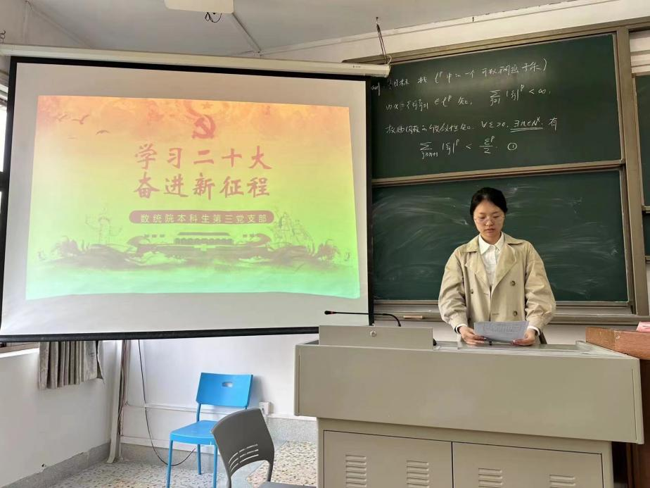 本科生数一党支部书记黄佳木从如何在学习贯彻党的二十大精神上上做到扎实认真为大家讲解了相关内容。他强调各位党员要充分认识开展学习贯彻党的二十大精神的重大意义,进一步提高站位,将这项重大的政治任务扛在肩上、抓在手上,务求取得扎扎实实的成效。他指出,对党忠诚既是对党员最基本的政治要求,也是党员最重要的政治素养。作为一名共产党员,初心的第一要义就是坚定对党的忠诚。