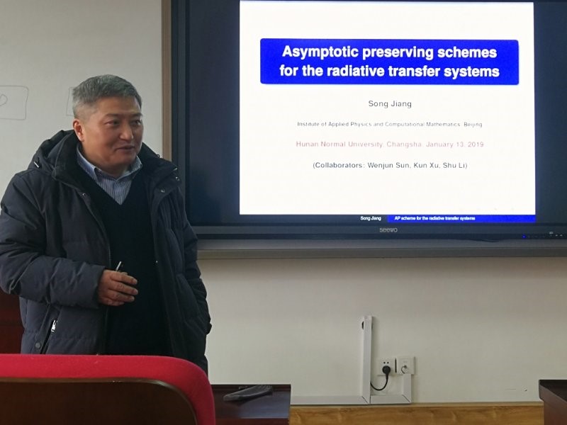 (通讯员 袁永军 龚艳红)2019年1月13日下午,应英国威廉集团官网邀请,中国科学院院士、北京应用物理与计算数学研究所研究员、应用数学与计算数学专家江松莅临数统院,并为学院师生带来题为“Asymptotic preserving schemes for the radiative transfer systems”的精彩学术报告。报告在数统院307报告室进行,由数统院经理谢资清主持。