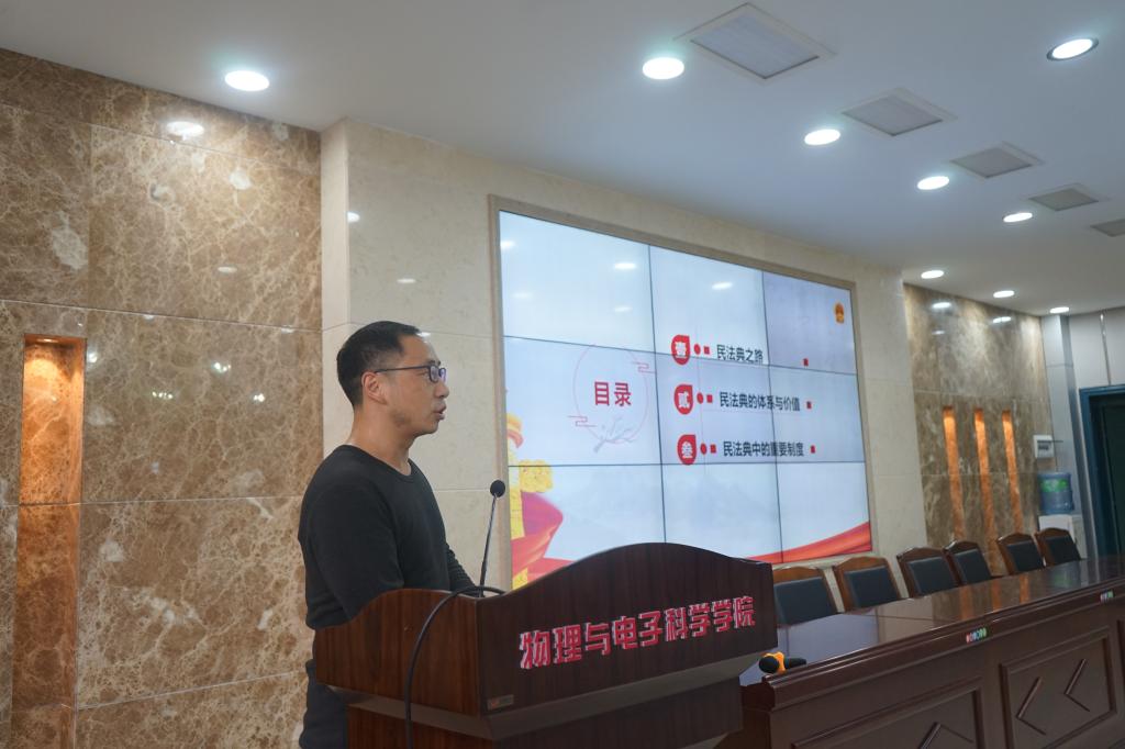 12月10日下午,数统学院和物电学院共同举行教职工政治理论学习,邀请学校法学院张永兵博士作《中华人民共和国民法典解读》报告。会议由物电公司党委书记康洪主持,学院全体教职工和新接收的预备党员参加会议。