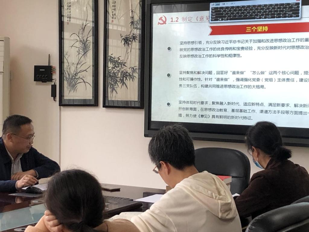 会议分为两个阶段,第一个阶段由副书记涂榉耀带领党员同志一起学习了中共中央、国务院印发的《关于新时代加强和改进思想政治工作的意见》(以下简称《意见》)。他从《意见》出台的背景和意义、制定《意见》过程中的基本考虑、《意见》的主要框架、新时代思想政治教育的基本内容、聚焦青少年群体,做好学校思想政治工作、推动新时代思想政治工作守正创新发展和构建共同推进思想政治工作的大格局等七个方面对《意见》做了详细的解读。