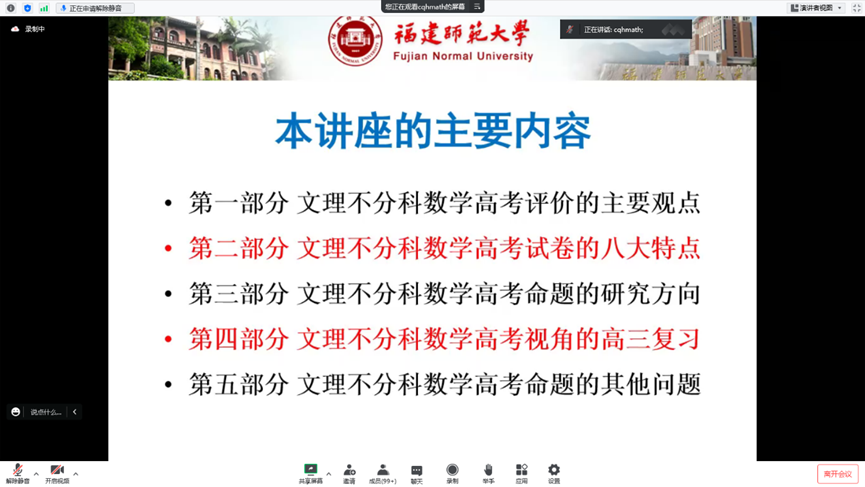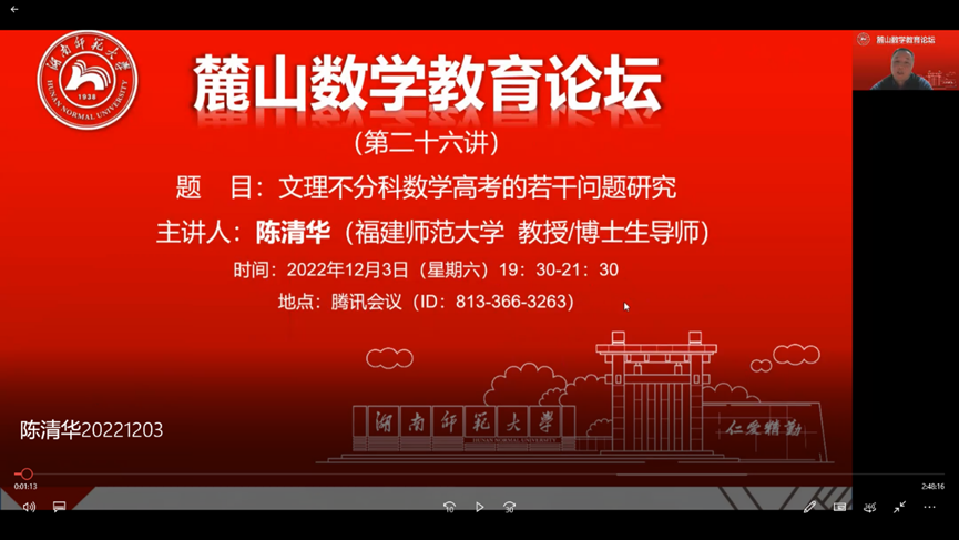 2022年12月3日星期六晚上7:30-9:30,福建师范大学陈清华教授做客英国威廉希尔公司“麓山数学教育论坛”,通过腾讯会议平台进行了一场主题为“文理不分科数学高考的若干问题研究”的讲座。此次讲座由数学系副主任袁智强主持。