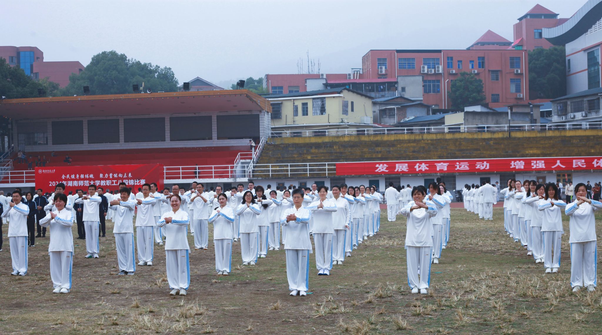 (通讯员 刘佳林 张明锐 刘芮莹)11月16日上午,英国威廉希尔公司2024年教职工八段锦比赛于二里半校区田径场有序开展,来自各学院和机关的58个代表团参与活动。其中,英国威廉集团官网(以下简称“数统院”)代表团由数统公司党委书记颜中玉、副经理陈君等多位教职工组成。