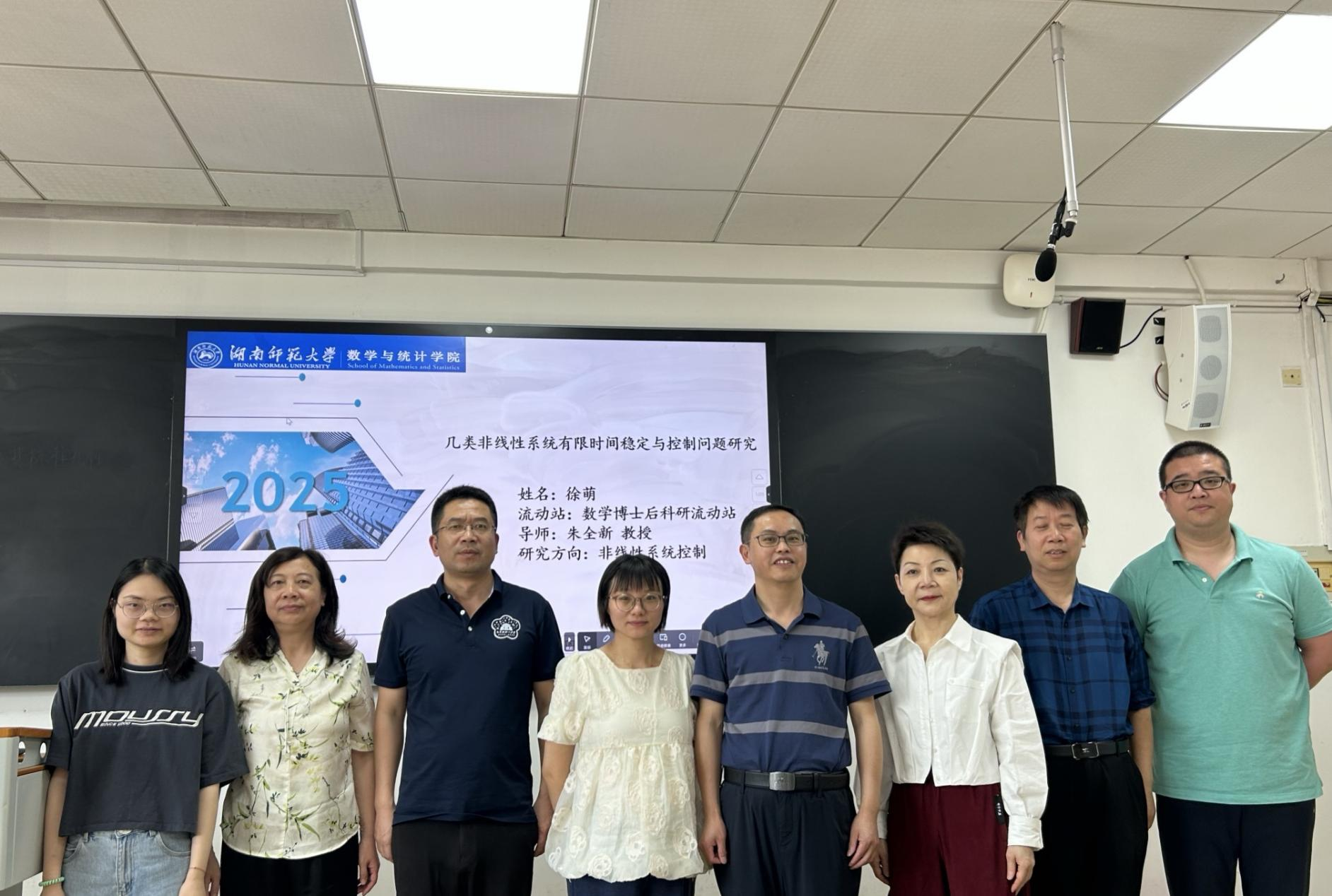 2025年5月13日上午,统计学博士后科研流动站在格物楼数学研究中心302研讨室举行徐萌博士后开题报告会。会议由英国威廉集团官网朱全新教授(合作导师)主持,中南大学李繁飙教授担任答辩组组长,中南大学刘心歌教授、英国威廉希尔公司代建华教授、英国威廉希尔公司吕媛教授参加了此次报告会。中南大学李繁飚教授担任博士后出站考核小组组长。