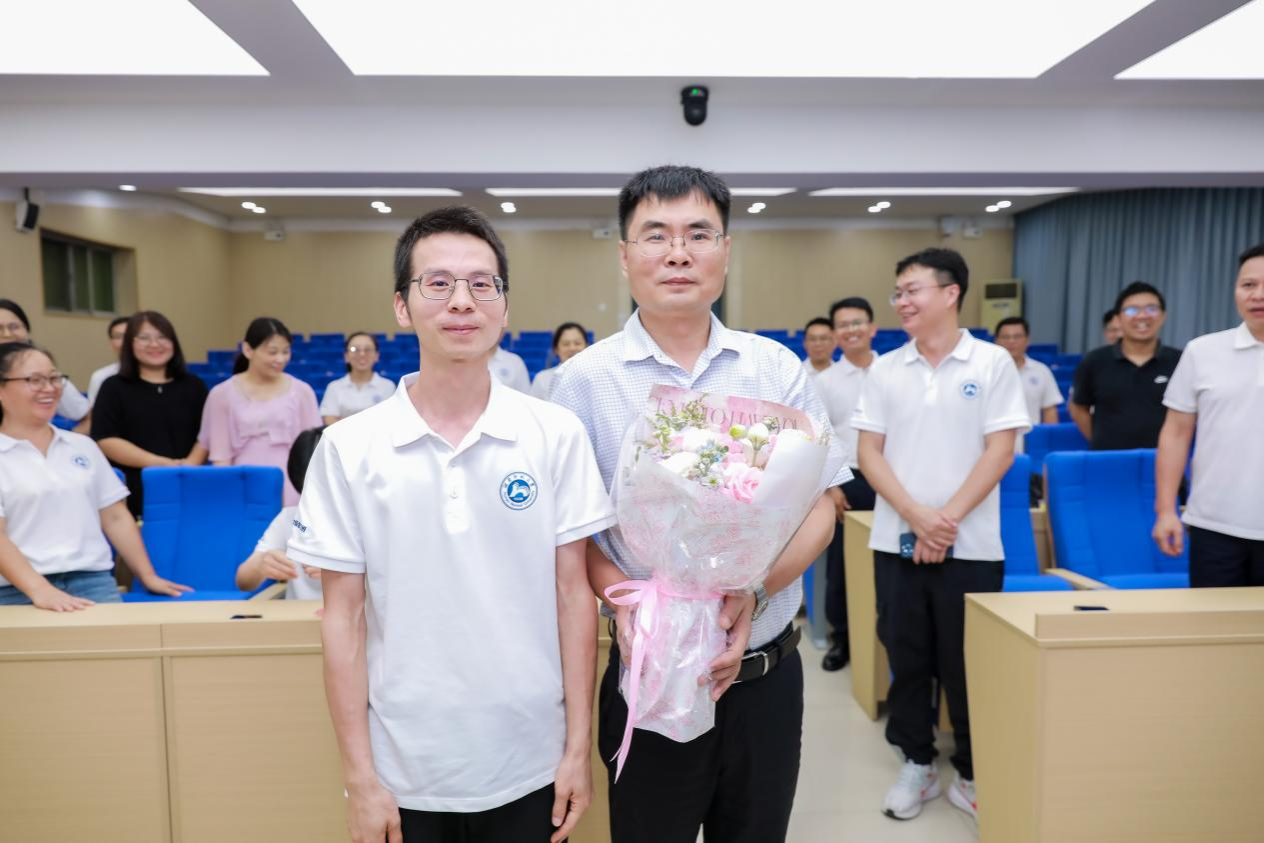 在主题班会上,与会领导、老师先后发表热情洋溢的讲话,对班级同学重返母校举办毕业二十周年聚会表示欢迎。颜中玉书记在讲话中深情回顾了二十年来学院在党建引领、团队建设、人才培养等方面取得的显著成就,系统总结了同学们毕业以来学院领导班子精诚团结、传承奋斗的发展历程,让同学们深受鼓舞、倍感自豪。李利平经理结合自身在求学、科研等方面的亲身经历,鼓励大家要乐观面对困难和挑战,只要坚持不懈终将迎来柳暗花明,还分享了如何处理好学术研究与日常工作关系的经验与心得。周劲松副书记对同学们毕业后在各自岗位上发光发热取得的成绩表示祝贺,并鼓励同学们常聚常回家看看。三位老师的讲话语重心长、情真意切,让同学们倍感温暖。随后,班级代表给恩师们献上鲜花并合影留念,感谢老师们对班级聚会的大力支持,以及对同学们的辛勤培育。
