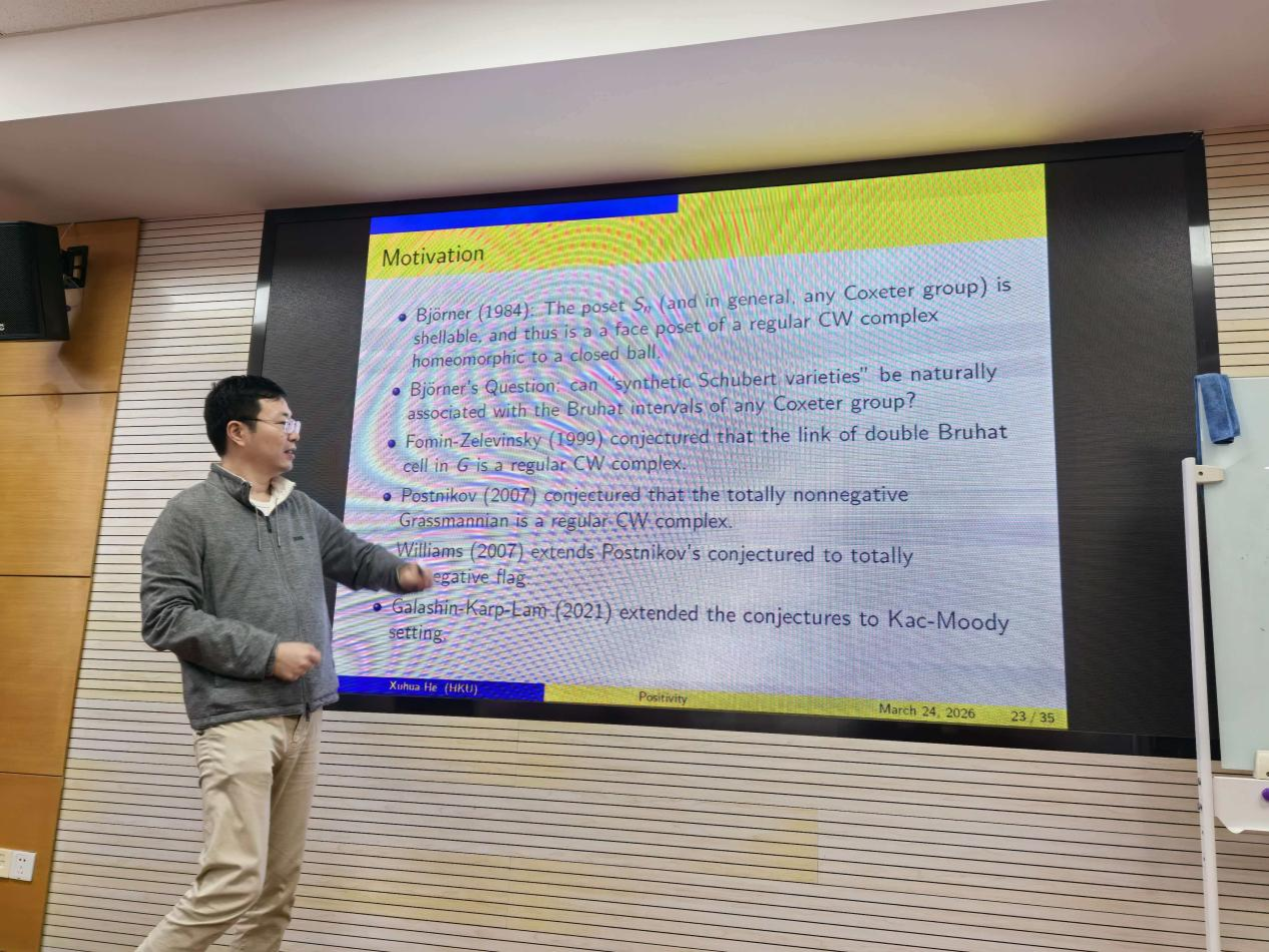 2026年3月24日下午,“代数与几何系列报告”在格物楼英国威廉希尔公司数学研究中心528报告厅隆重举行。国际知名数学家、香港科学院院士、香港大学讲座教授何旭华应邀作了题为“Total positivity: combinatorics,geometry, and representation theory”的学术报告。