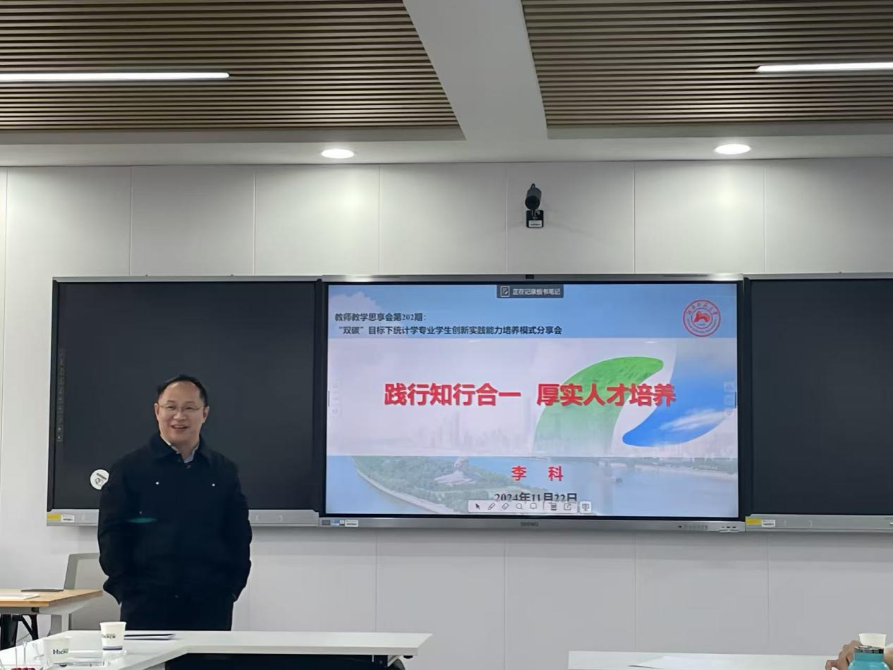(通讯员 林杨暄)11月22日下午,公司第202期教师教学思享会在格物楼402智慧教室举行。本次思享会以“‘双碳’目标下统计学专业员工创新实践能力培养模式分享”为主题,由英国威廉集团官网、湖南省双碳研究院经理李科教授担任主讲嘉宾,统计学系主任周杰明主持,共同探讨教育创新之路。