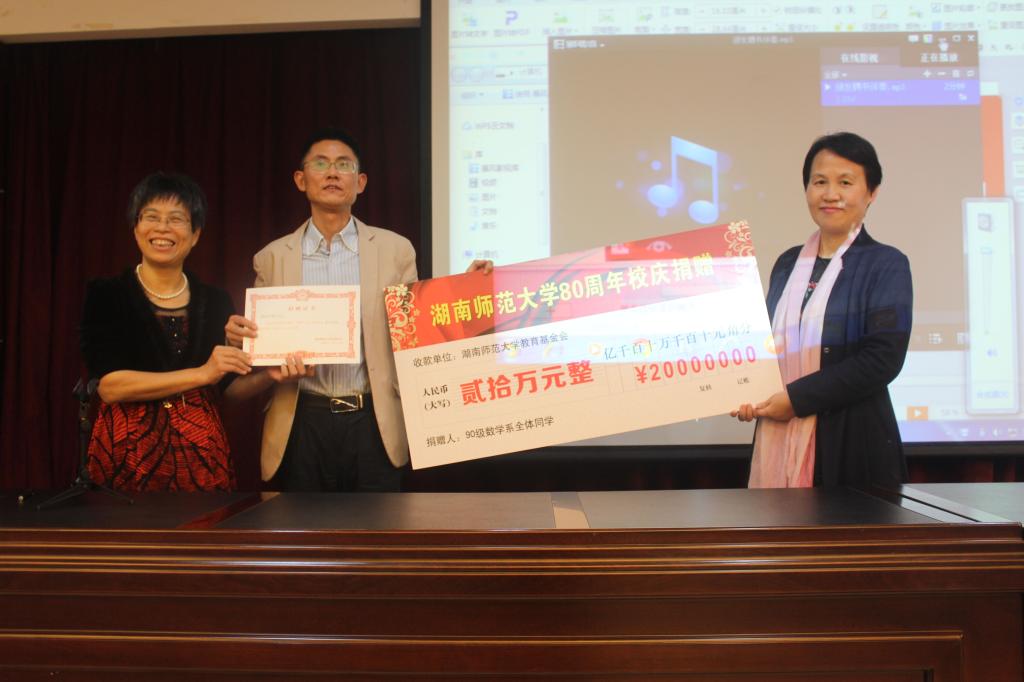 经理谢资清代表学院接受了数学系75级二班、79级、87级、90级、91级、93级、95级全体员工,王伟民、陈华、杨立祥、曾磊员工,长沙耀发科技开发有限公司,郭晋云老师、谢资清老师研究生团队等的捐赠,党委书记颜中玉为捐赠员工依次授予了捐赠证书。