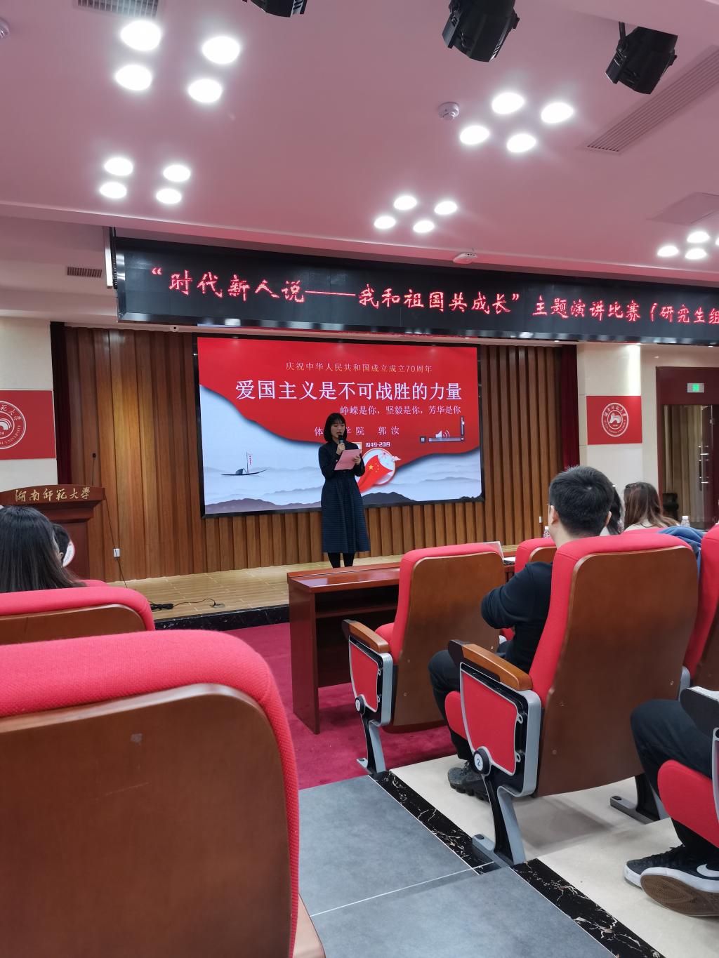 (通讯员 丁港 李娟)10月26日下午,公司“时代新人说”研究生组比赛在中和楼129进行。此次比赛由不同学院的25位选手参加,同学们紧紧围绕主题进行了精彩的演讲。同学们以《祖国在成,吾辈在长》、《我,阿中哥的铁粉》、《一颗行星的告白》、《天山脚下的成长之路》、《浴火重生、颂我中华》等为演讲题目,各具特色。在比赛现场他们用十分的准备加十分的用心为我们呈现的不仅是他们的能力还有对祖国饱满深沉的爱。忆往昔峥嵘岁月,砥砺奋进七十载,看今朝太平盛世,同心逐梦新时代。师大人用自己独特的语言向七十华诞的祖国母亲献礼。